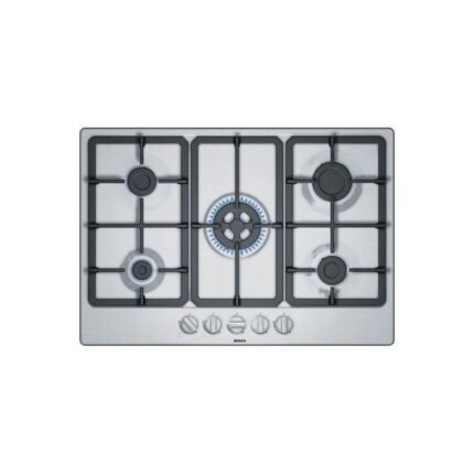 Bosch Table de cuisson plaque à gaz encastrable en acier inoxydable ,75cm ,5 feux dont un Wok ,grilles en fonte renforcée ,sécurité