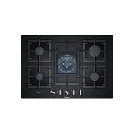 Bosch Table de cuisson plaque à gaz encastrable en verre noir ,75cm ,FlameSelect ,5 feux dont un Wok ,grilles en fonte renforcée ,sécurité