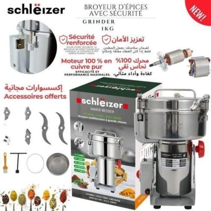schlëizer Moulin à épices broyeur professionnel Haute vitesse multifonctions broyeur d’herbe Électrique 1,5 KG en acier inoxydable à six lames moteur 100% cuivre très puissant 3200W système de sécurité