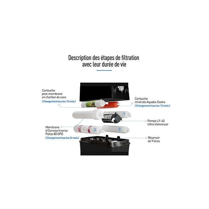 Les consommables AQUABO TIGER offrent un excellent rapport qualité-prix. Ils sont moins chers que les consommables des autres et durent plus longtemps. Les préfiltres peuvent durer jusqu’à 12 mois et la membrane jusqu’à 24 mois.