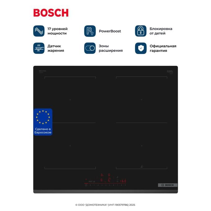 Bosch Plaque électrique à induction 4 foyers smart connectée détecteur de combustion PowerBoost démarrage rapide TouchScreen tactile 60cm sécurité enfant 17 réglages 2 ans de garantie